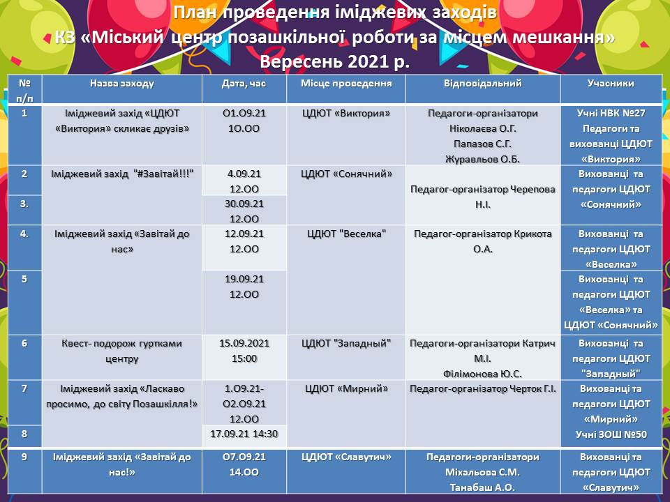 План роботи Комунального закладу «Міський Центр позашкільної роботи за місцем мешкання» квітень 2021 року